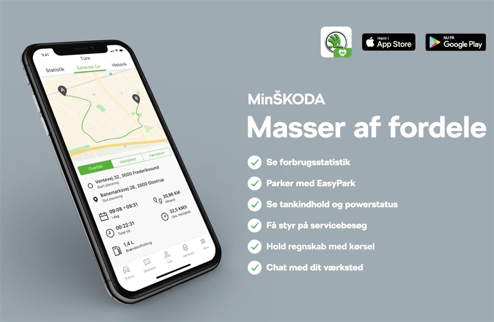 MinŠkoda er den direkte onlineforbindelse mellem dig og din bil på din smartphone. Med MinŠkoda kan du se detaljer om bl.a. din bils placering og tilstand, dine forskellige køreture og desuden kontakte dit værksted.
